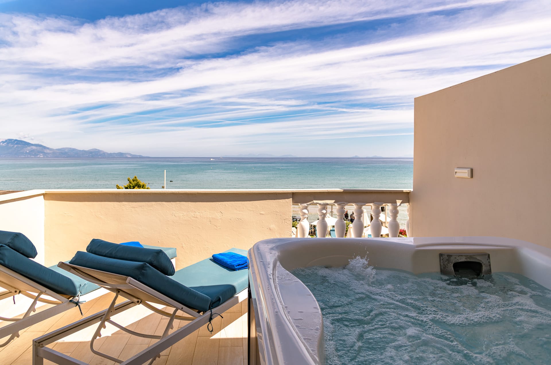 This room type is designated for a couple or single traveller wanting to relax ideally, with unlimited sea view, Jacuzzi and a large balcony overlooking the sea. It can be either a double or a twin room, according to your preference. This room is located on the first floor, has sunbeds, sofabed. It has LCD 45 inches , air-condition, high speed Wifi , bathrobe, slippers and espresso machine with organic coffee